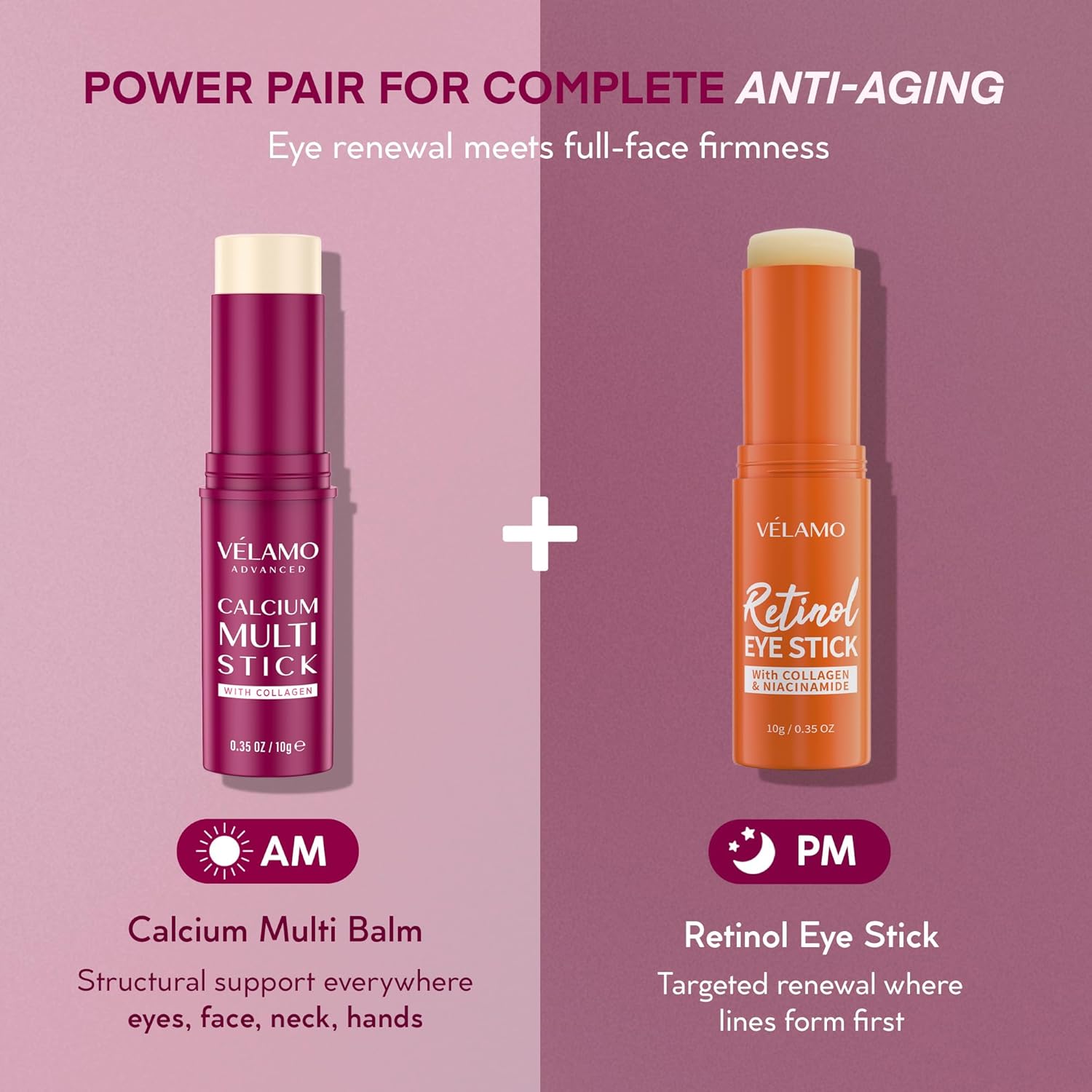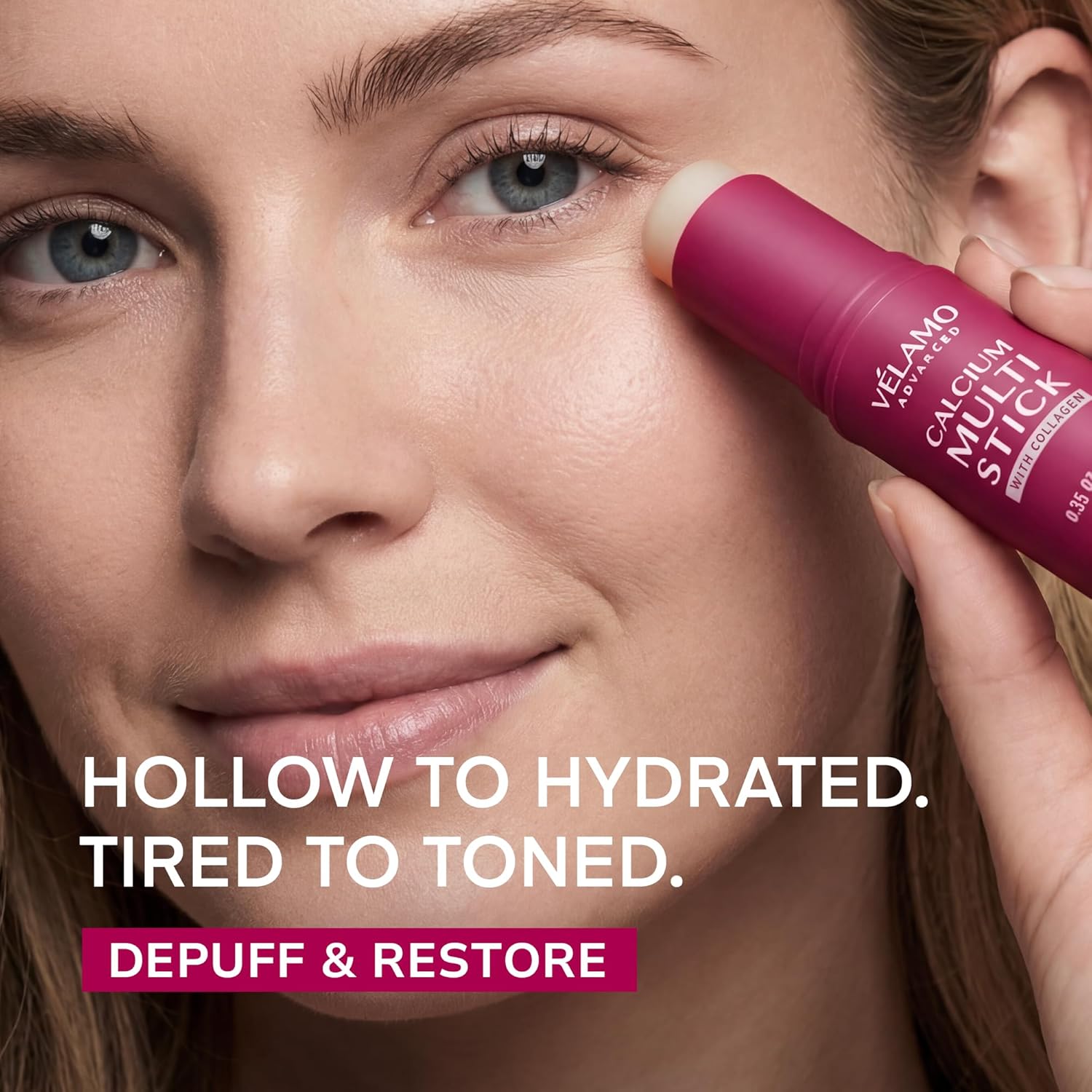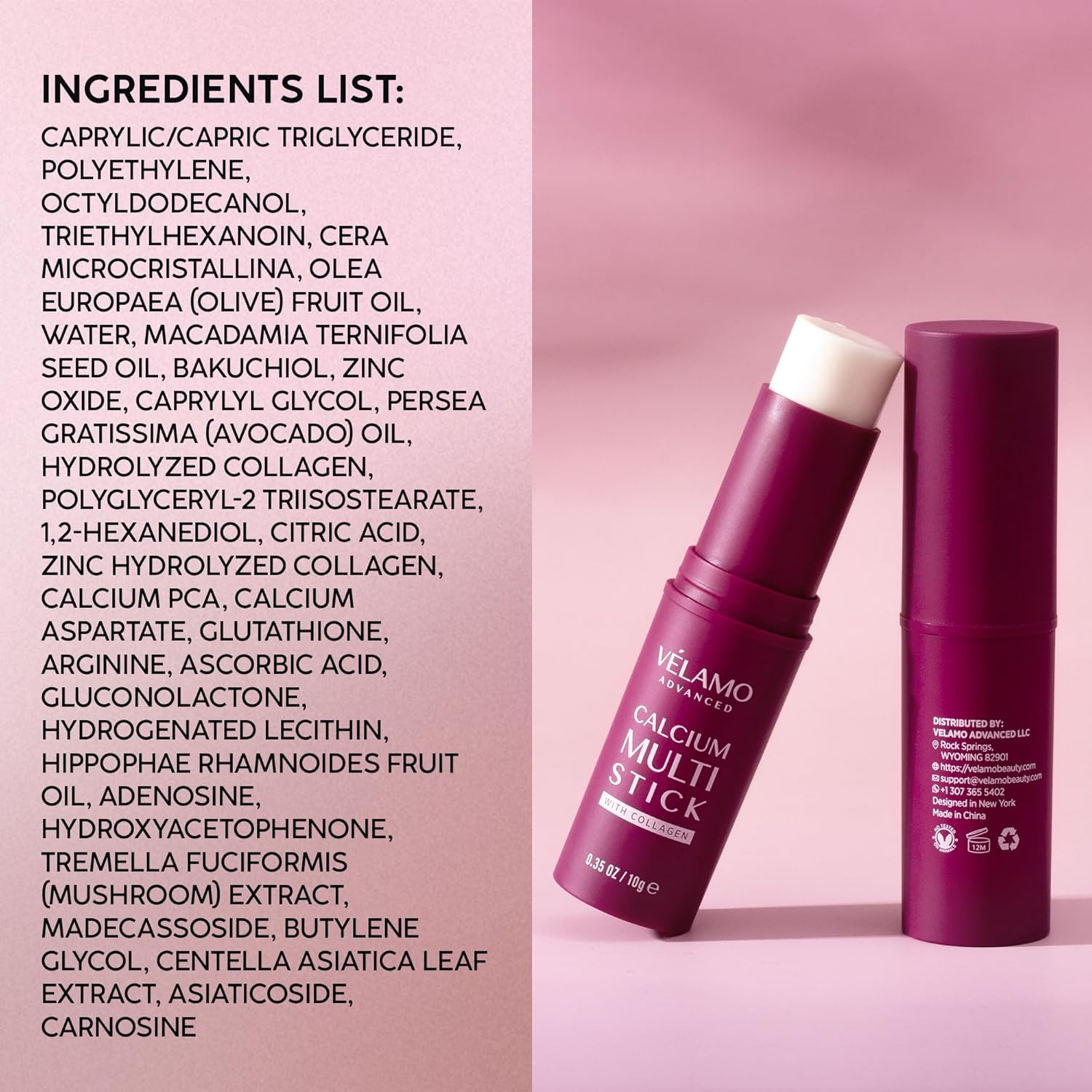 - Mess-Free & Easy Application: No fuss, no mess. Simply glide the calcium volume stick gently under the eyes, face and neck. Ideal for on-the-go hydration at home, work, or travel—just swipe and enjoy refreshed, smooth skin. Perfectly sized, this solid, non-liquid formula is a TSA-compliant travel size toiletry. This mess-free stick is an indispensable airplane travel essential for refreshing your skin high above the clouds or during layovers. True to VELAMO ADVANCED’s "Beauty With Ease".