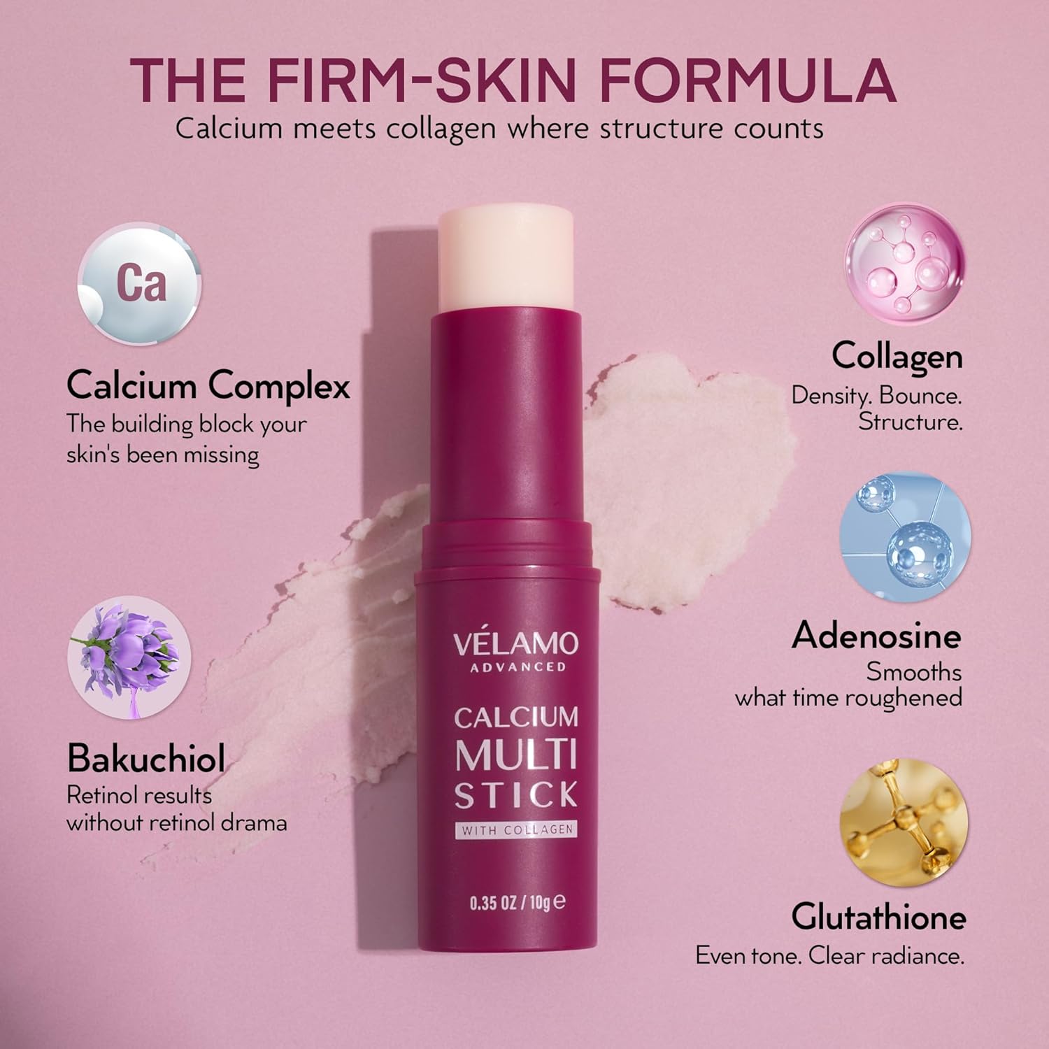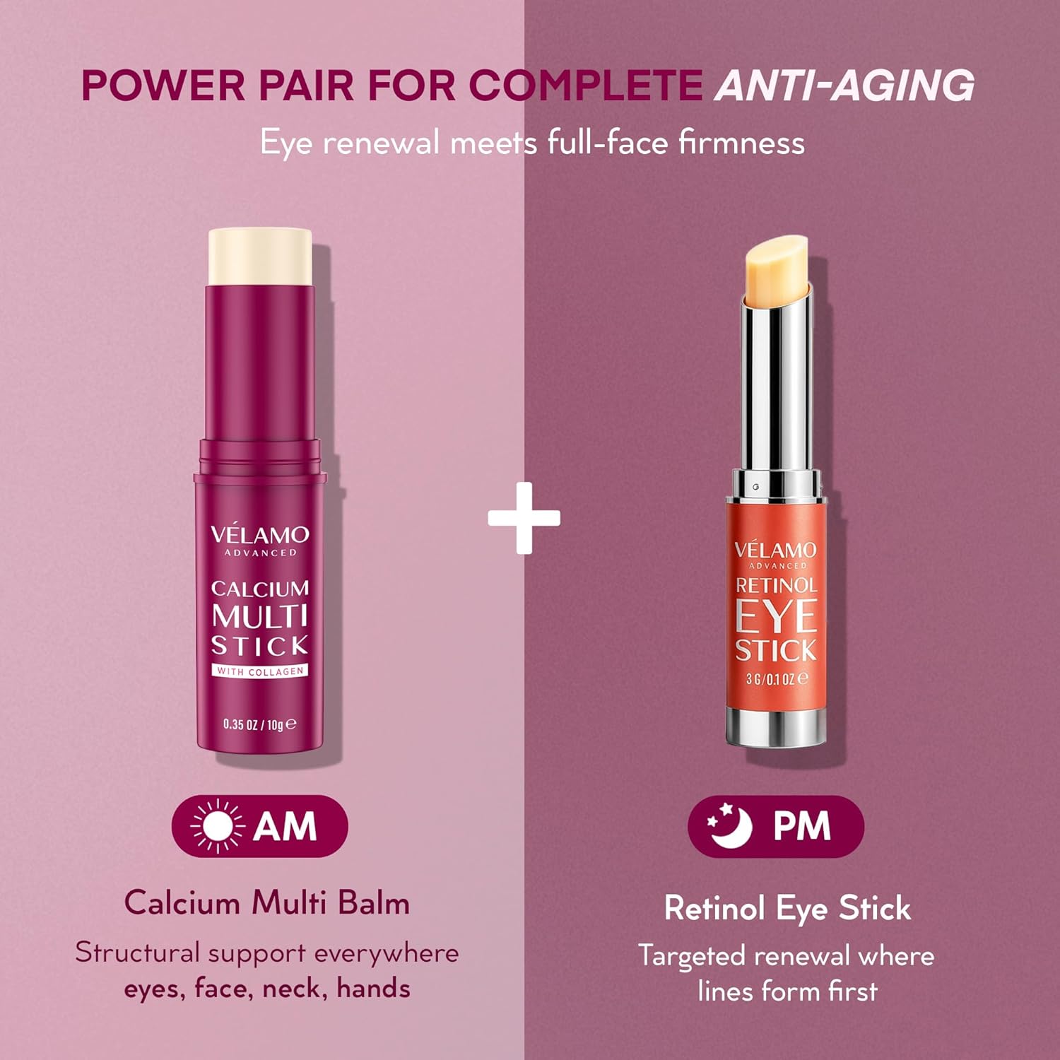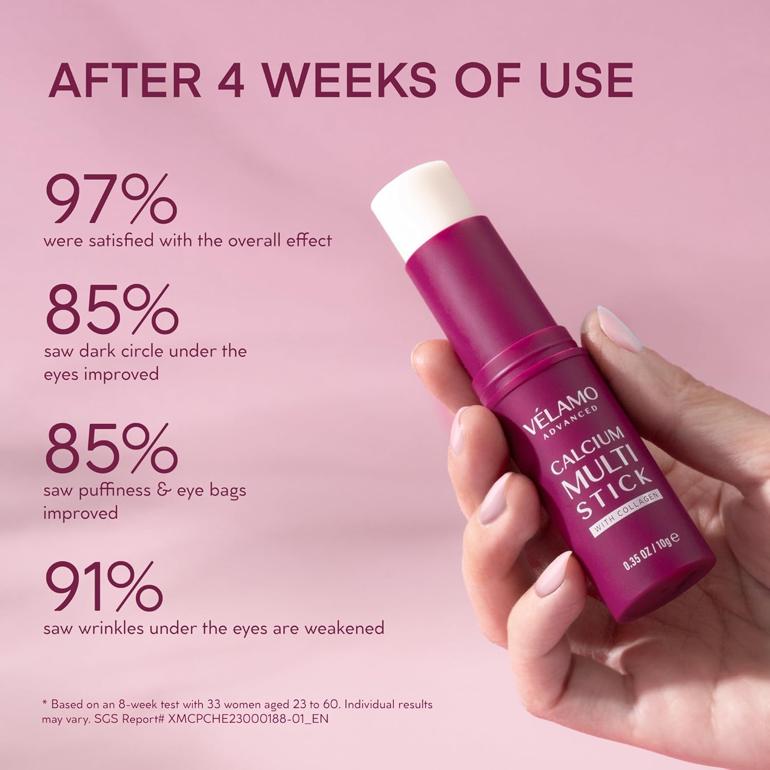 - Mess-Free & Easy Application: No fuss, no mess. Simply glide the calcium volume stick gently under the eyes, face and neck. Ideal for on-the-go hydration at home, work, or travel—just swipe and enjoy refreshed, smooth skin. Perfectly sized, this solid, non-liquid formula is a TSA-compliant travel size toiletry. This mess-free stick is an indispensable airplane travel essential for refreshing your skin high above the clouds or during layovers. True to VELAMO ADVANCED’s "Beauty With Ease".